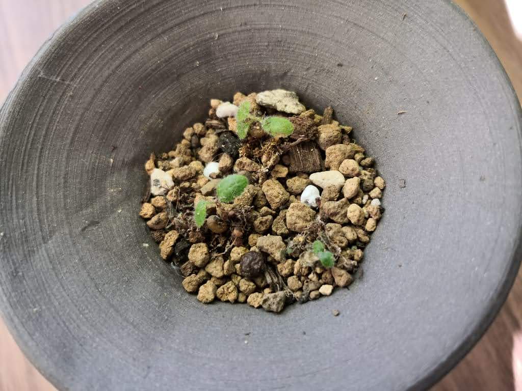 葉の大きさも大きいもので1ミリに達しようかというところでまだ毛は生えていません。根本に塊根部分はまだ見当たりません。