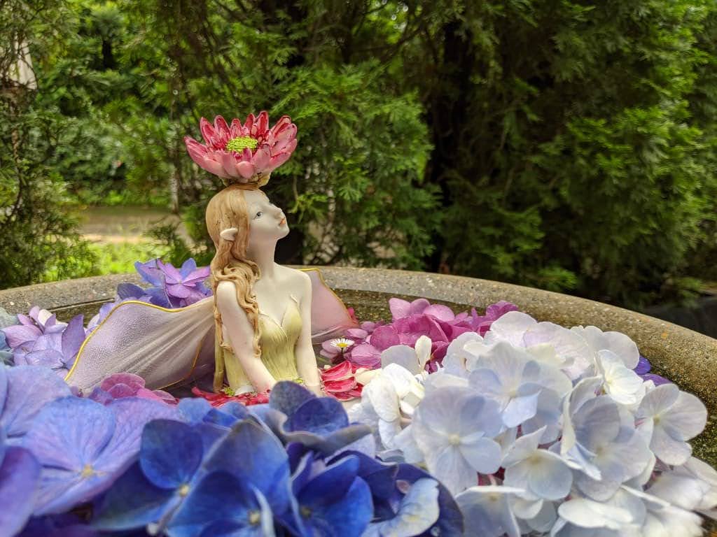 バラの花を浮かべたバードバスにもフェアリーが。